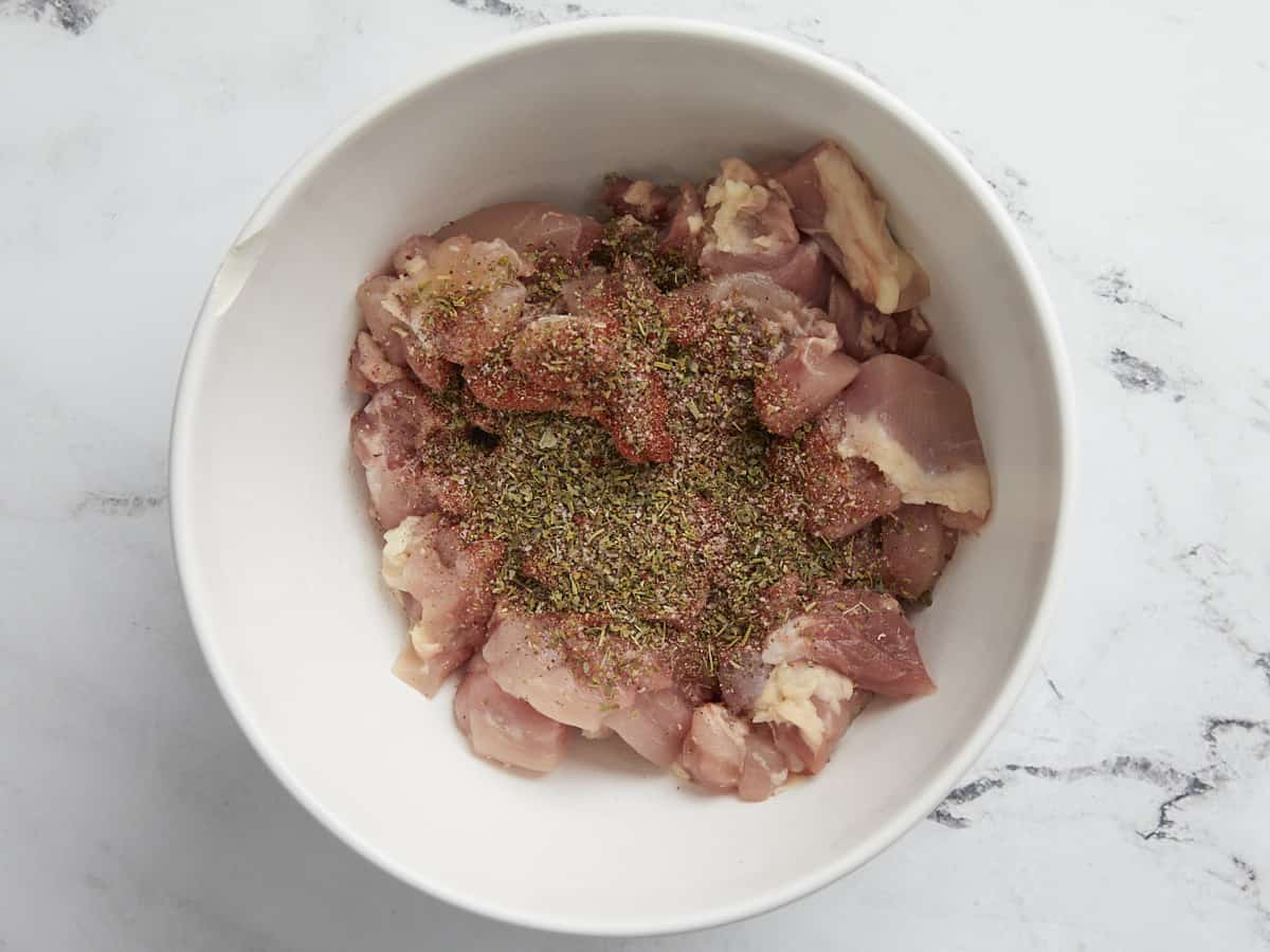 Coupez 1,25 livre de cuisses de poulet (environ 4 à 5 cuisses) en morceaux de 2 pouces. Ajoutez le poulet dans un bol et garnissez-le de 1 cuillère à soupe d’assaisonnement italien, 1/2 cuillère à café de paprika fumé, 1/2 cuillère à café de sel et 1/4 cuillère à café de poivre. Mélanger jusqu’à ce que le tout soit combiné.