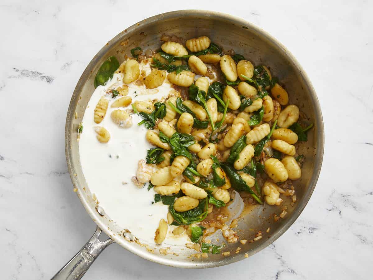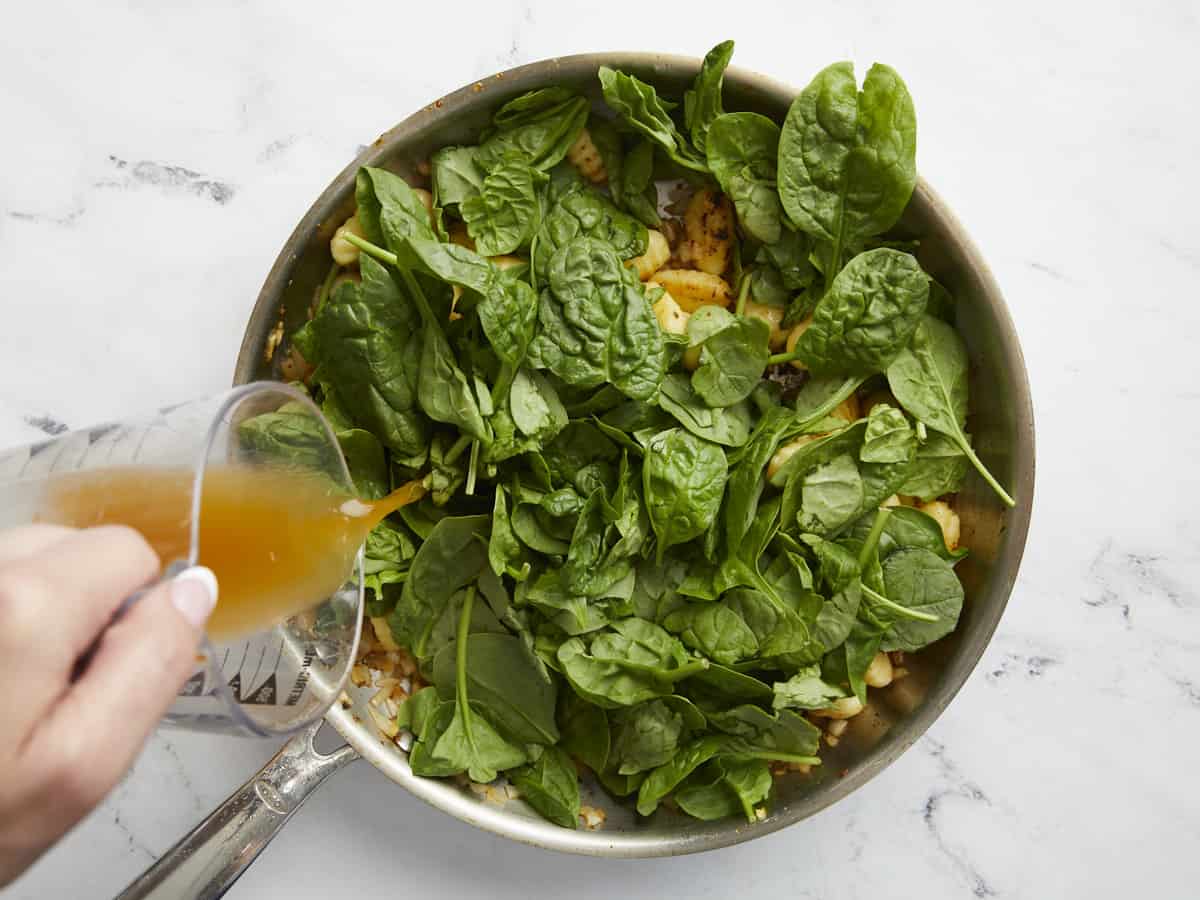 Ajouter 2 tasses d’épinards et 1 tasse de bouillon de légumes dans la poêle. Couvrir la poêle. Cuire 1 à 2 minutes jusqu’à ce que les épinards soient fanés et que les gnocchis soient hydratés.