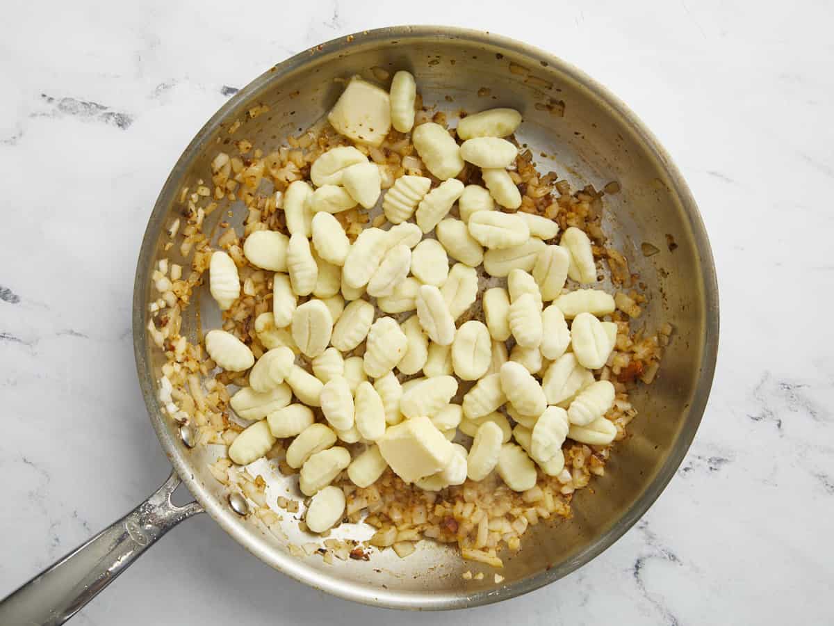 Ajoutez 1 livre de gnocchis de pommes de terre secs et 1 cuillère à soupe de beurre salé dans la poêle. Faites dorer les gnocchis pendant 2 minutes.