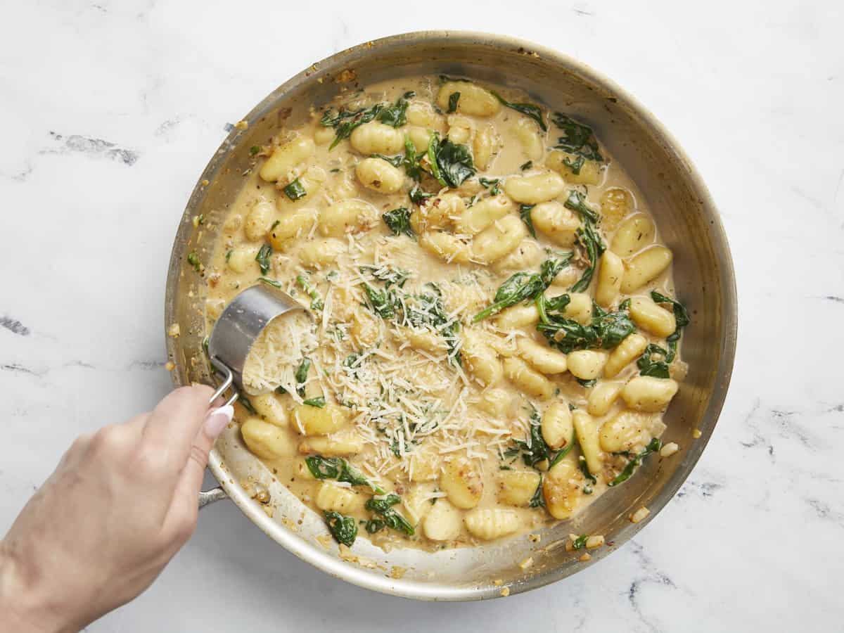 Retirez la casserole du feu. Ajoutez 1/4 tasse de parmesan dans la poêle et remuez jusqu’à ce qu’il fonde, créant une sauce veloutée.
