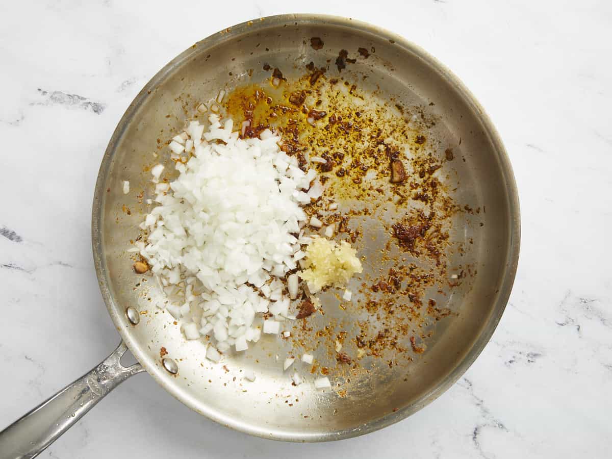 Ajoutez 1 oignon coupé en dés et 2 gousses d’ail émincées dans la poêle. Faire revenir jusqu’à ce que les oignons soient ramollis et que l’ail soit parfumé, environ 2 minutes.